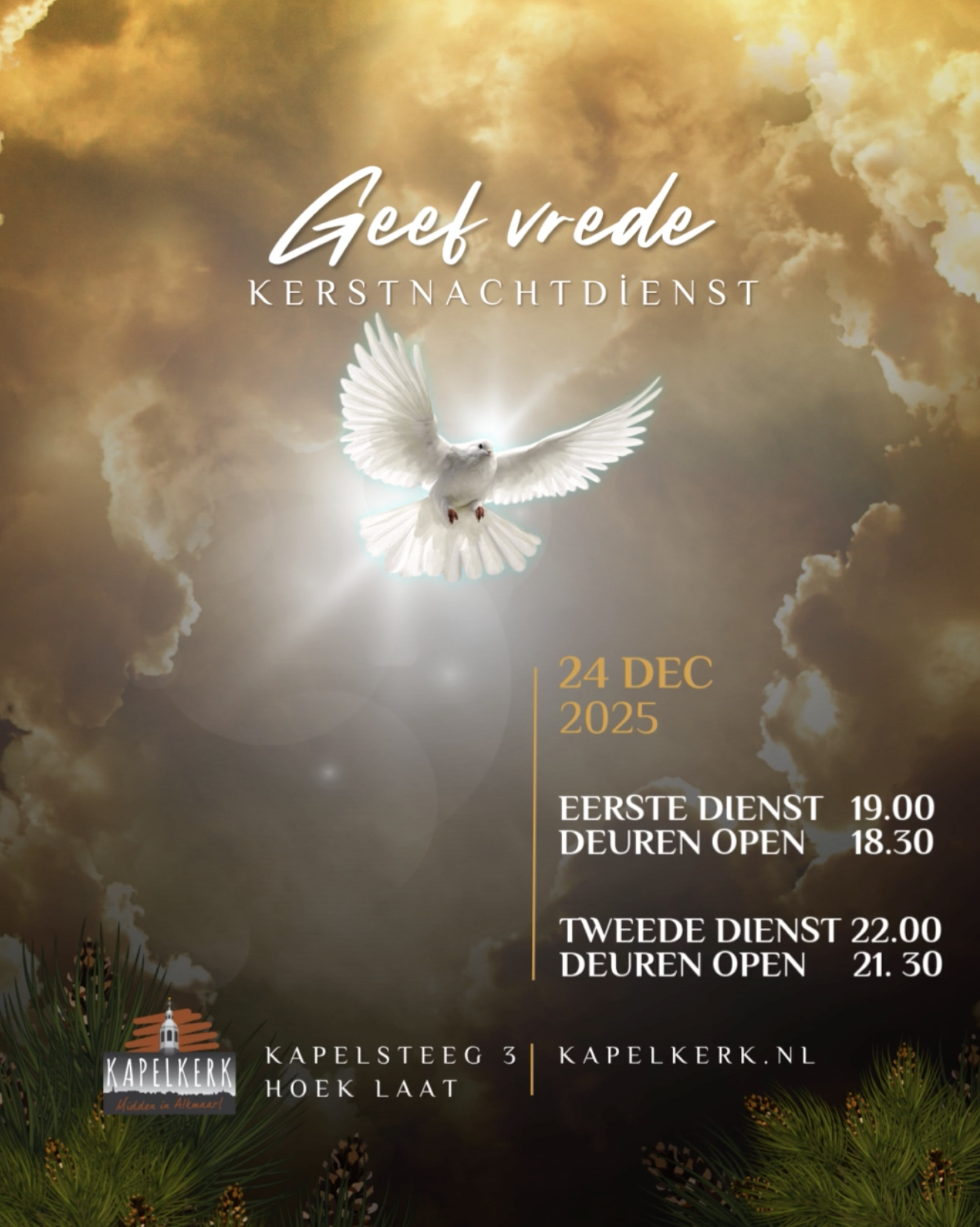 De Kerstnachtdienst is altijd een bijzonder moment in de Kapelkerk! We zien er naar uit om het feest weer gezamenlijk in de kerk te mogen vieren. We zingen kerstliederen met orgel en band en luisteren naar een overdenking. Na de dienst is er gezelligheid met glühwein en kerstbrood! De dienst met als thema “Geef Vrede”